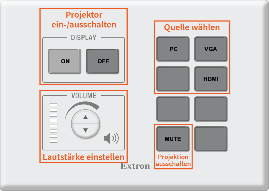 In kleineren zentral verwalteten Lehrveranstaltungsräumen oder bei kompakten Anlagen kommt ein Tastenpanel zum Einsatz. Damit können Sie: