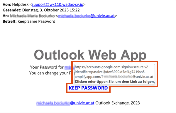 - do not forward the e-mail except to the ZID IT security team (security.zid(at)univie.ac.at) or to other qualified experts for analysis purposes. In this case, make sure to send the e-mail as an attachment in the form of an EML file. This allows for analysing the metadata of the e-mail. Follow the steps in the user guide Forwarding e-mails as an attachment.