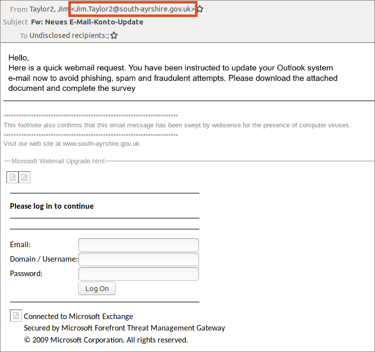 In such cases, make sure to pay attention to the sender’s e-mail address. Often, it is easy to clearly identify it as a fake. However, there are also examples where the address seems plausible at first glance, as the following screenshot shows: