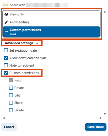 Specify which permissions the person receives. Under Advanced settings, you can: