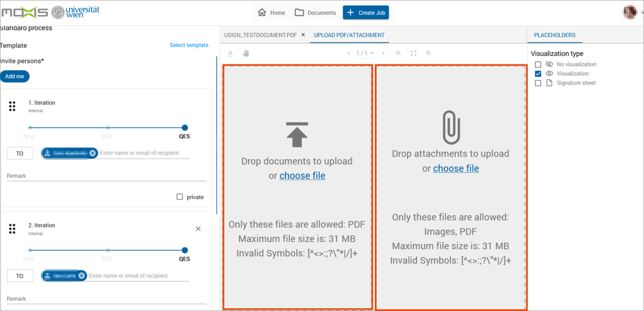 If there is not enough space on the document, you can either select No visualization under Visualization type to not use placing, or use Signature sheet to generate an additional page on which to place the signatures.