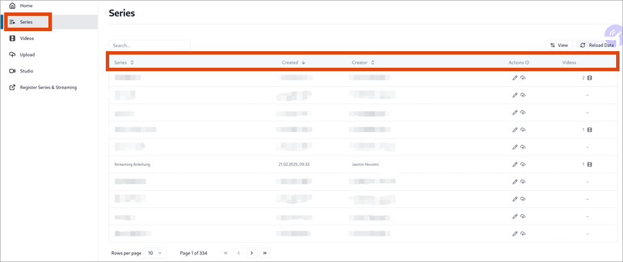 All series for which you have editing rights are listed. These are series that you have registered for u:stream yourself or for which you have been co-authorised.
