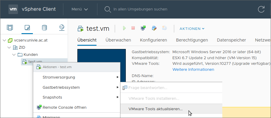 Der ZID empfiehlt, VMware Tools zu installieren und immer auf dem neuesten Stand zu halten. Obwohl das Gastbetriebssystem des virtuellen Servers ohne VMware Tools ausgeführt werden kann, sind viele weitere Funktionen erst verfügbar, wenn Sie VMware Tools installieren. Ohne VMware Tools können Sie beispielsweise den virtuellen Server nicht ordnungsgemäß über die Symbolleiste herunterfahren oder neu starten, sondern nur abschalten.