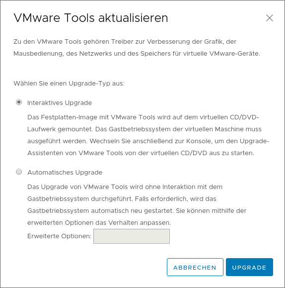 - Ein Pop-up-Fenster mit dem Titel VMware Tools aktualisieren öffnet sich.