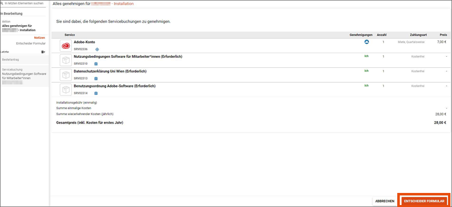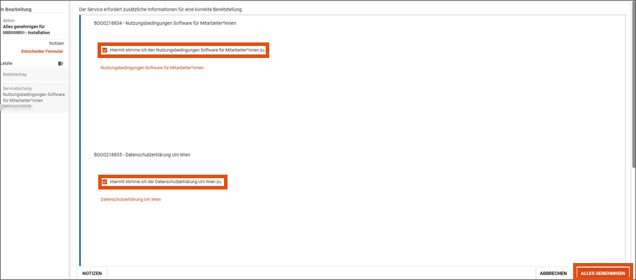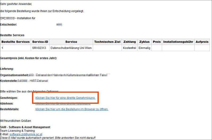 sam.zid@univie.ac.atund dem Betreff Entscheidung erforderlich für Bestellung: ORDxxxxx – Installation. - Öffnen Sie das E-Mail und klicken Sie auf den Link Klicken Sie hier für eine direkte Genehmigung.