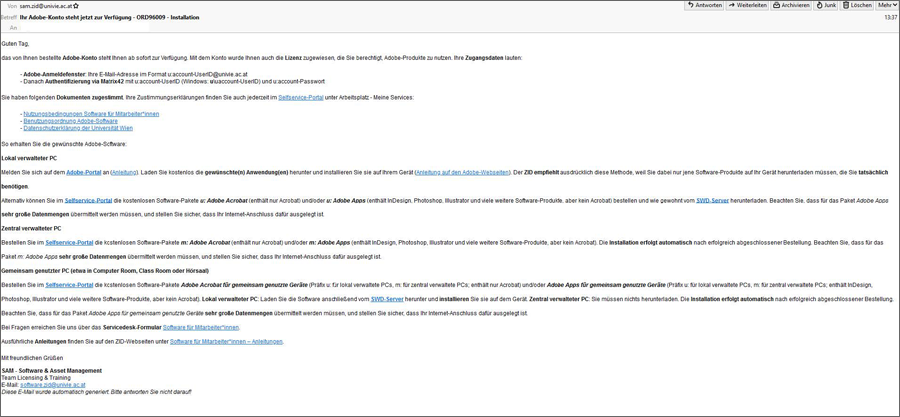- Falls der*die EDV-Beauftragte das Adobe-Konto im SAM-System für Sie bestellt hat, erhalten Sie ein E-Mail mit der Absendeadresse