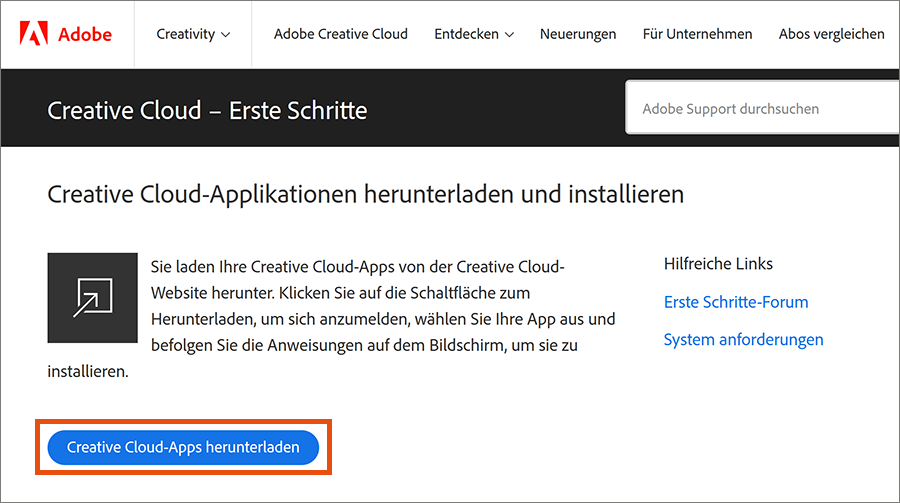 - Öffnen Sie die Adobe-Webseite Creative Cloud-Applikationen herunterladen und installieren.