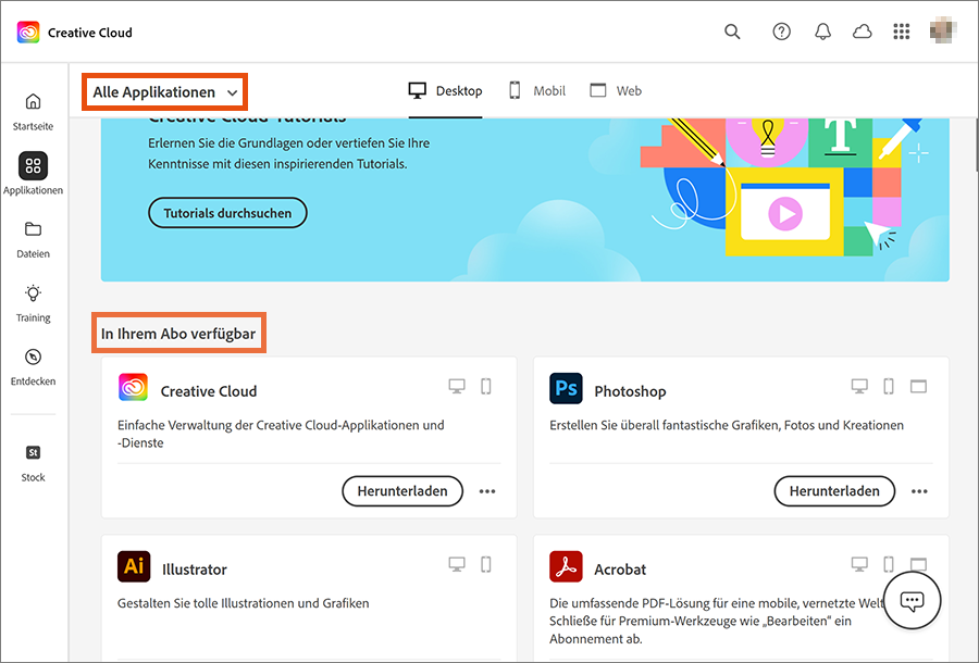 Sie erhalten unter Alle Applikationen im Bereich In Ihrem Abo verfügbar einen Überblick über alle Adobe-Produkte, die Ihnen im Rahmen der Lizenz zur Verfügung stehen.
