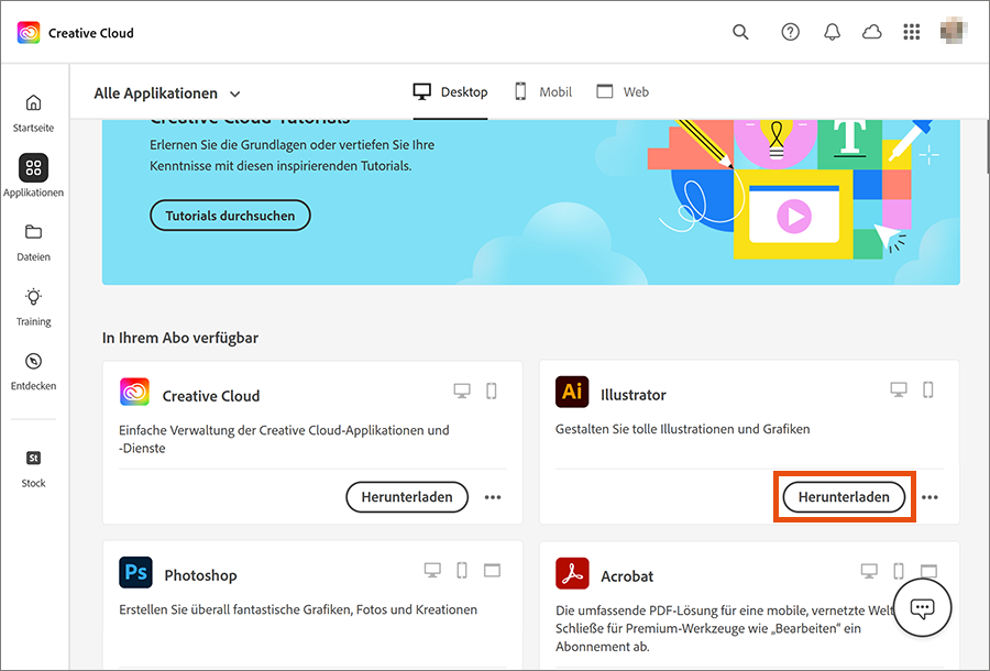 Wählen Sie die gewünschte Applikation aus (in diesem Beispiel Illustrator) und klicken Sie auf Herunterladen. Sie können später jederzeit weitere Applikationen hinzufügen.