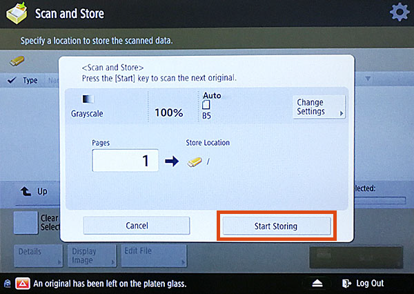 - Vorlage auf das Vorlagenglas legen oder Vorlageneinzug verwenden – Scan – (Optional: Scaneinstellungen anpassen) – Start – Start Storing