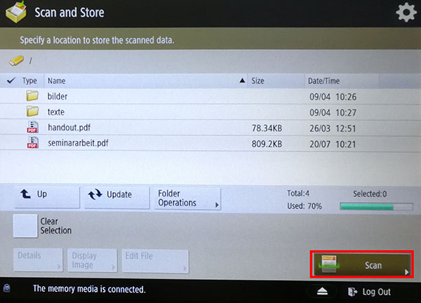 - Am u:print-Gerät anmelden – USB-Datenträger an der rechten Seite des Geräts einstecken – Home – Scan and Store – Memory Media (A:) – den Ordner wählen, in dem die Scans gespeichert werden sollen