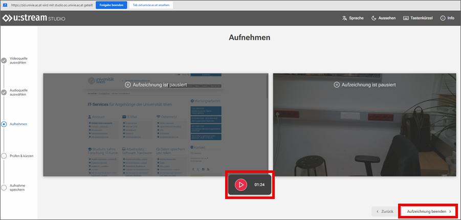 - Mit Klick auf Video aufnehmen wechseln Sie zu u:stream-Studio.