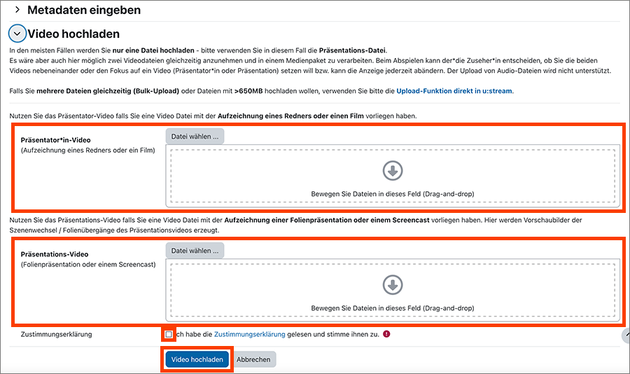 Öffnen Sie den Abschnitt Video hochladen. Hier können Sie ein Präsentator*in-Video und/oder ein Präsentations-Video hochladen.