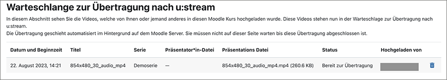 Im Abschnitt Warteschlange zur Übertragung nach u:stream sehen Sie die in dem Kurs hochgeladenen Videos, die sich derzeit in der Warteschlange befinden. Die Übertragung geschieht automatisiert im Hintergrund. Sie können diese Seite schließen, auch wenn die Übertragung noch nicht abgeschlossen ist.