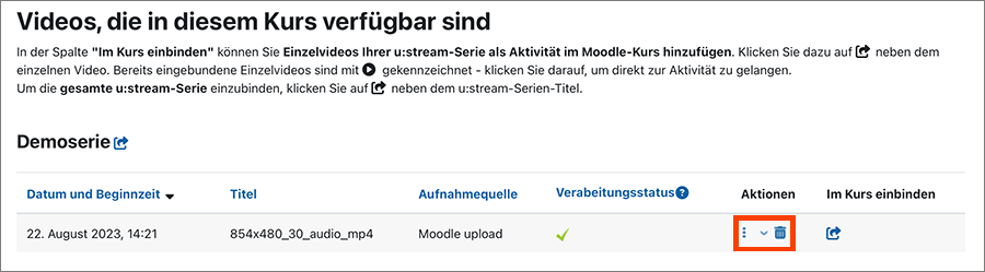 Erfolgreich hochgeladene Videos sind in der Tabelle unter Videos, die in diesem Kurs verfügbar sindaufgelistet und mit einem grünen Häkchen unter Verarbeitungsstatus gekennzeichnet. Diese Videos können Sie bearbeiten (3 vertikale Punkte ⁝) oder löschen (Papierkorb-Symbol).