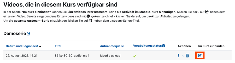 Klicken Sie in der Spalte Im Kurs einbinden beim jeweiligen Video auf das Pfeil-Symbol.