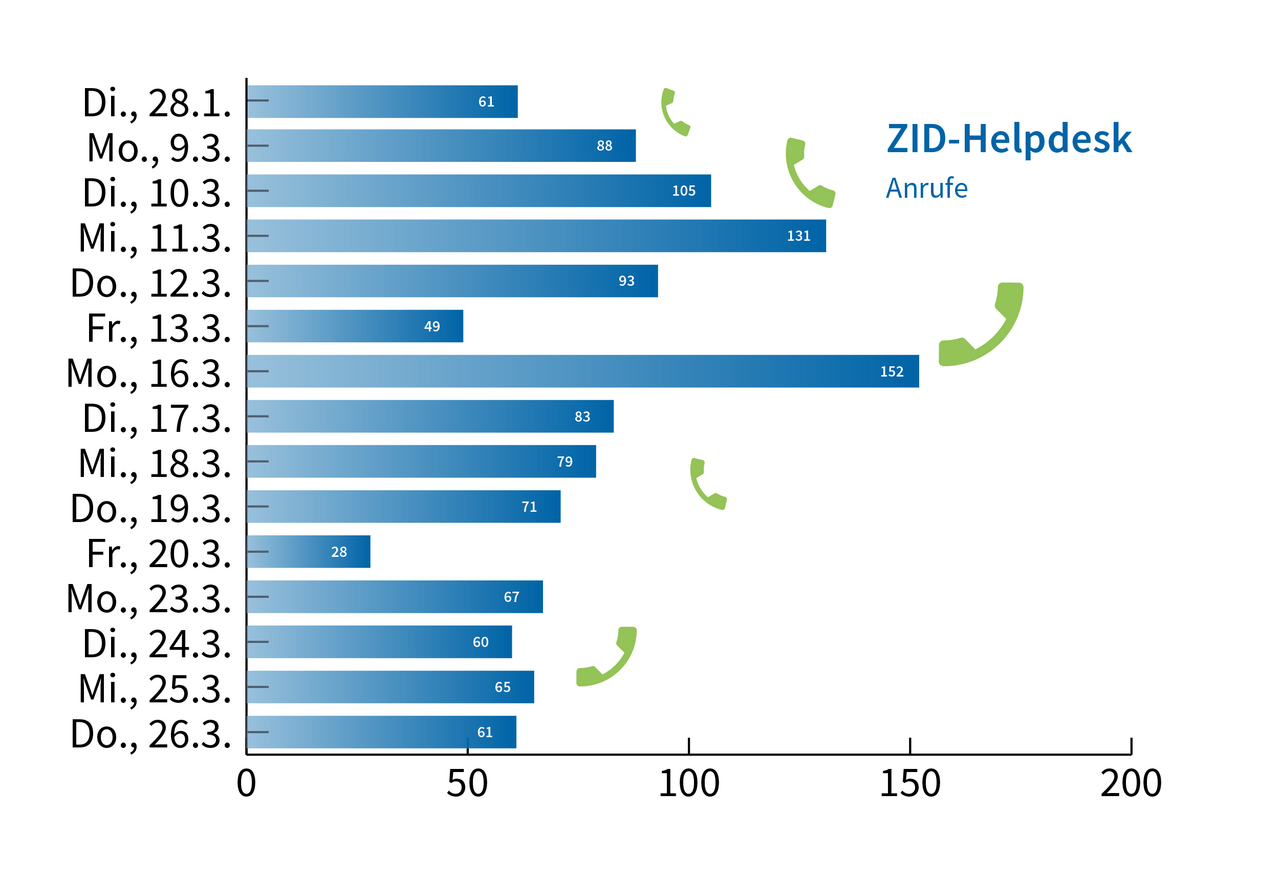 Am ZID-Helpdesk machte sich auf den ersten Blick scheinbar die neue Normalität von Homeoffice und home-learning bemerkbar. Die täglich abzuarbeitenden E-Mails und Tickets pendelten sich wieder auf 200 bis 300 ein, auch die Anzahl der täglichen Anrufe nähert sich mit 60 bis 70 wieder den Werte vor der Krise. Was die Zahlen nicht zeigen: Die Komplexität der Anfragen – und damit die Anzahl der notwendigen Rückfragen und die Gesamtdauer der Bearbeitung – ist weiterhin deutlich höher als vor Corona.