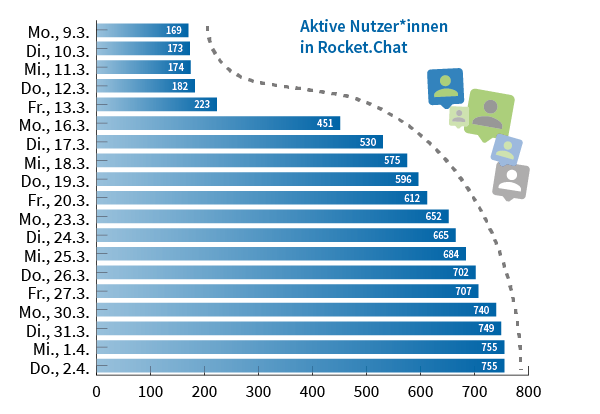 Der Zuwachs bei den aktiven Nutzer*innen in Rocket.Chat ist weiterhin moderat. Er betrug in der Woche von 27.03. bis 02.04. rund 7 Prozent (von 702 auf 755 Personen).