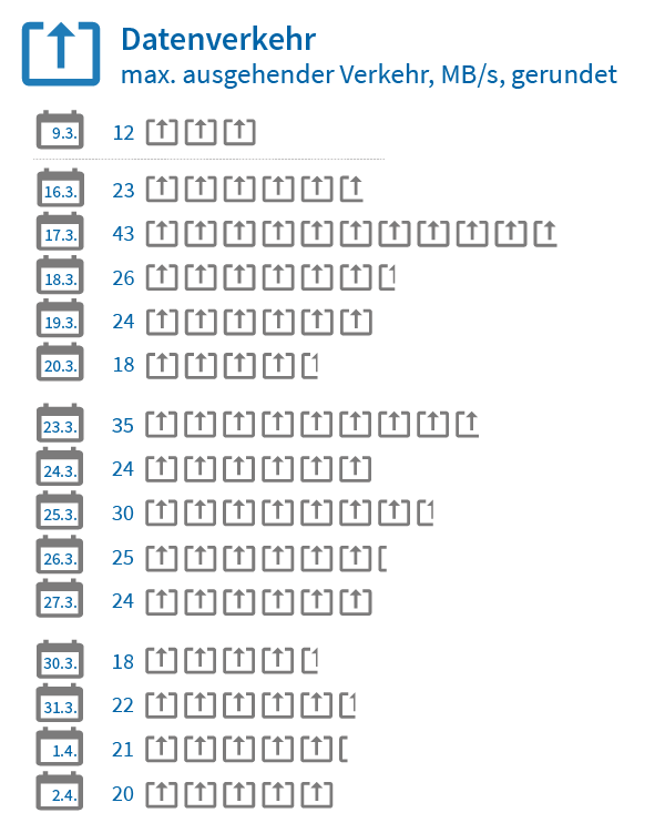 Das schlug sich natürlich auch im ausgehenden Datenverkehr nieder, der Ende Jänner einen Höchstwert von 25 MByte/s erreichte, nach dem 11.03. aber auf 40 MByte/s und sogar 43 MByte/s stieg.