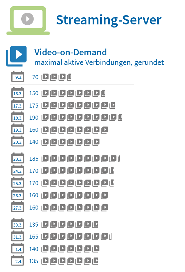 Bei der Einführung des Notbetriebs am 16.03. zeigte sich dann ein Spitzenwert von 208.000 neuen Dateien, der an den folgenden Tagen aber nicht wiederholt wurde: Die Nutzung pendelte sich wieder auf eine hohe fünfstellige Zahl von Dateien ein.