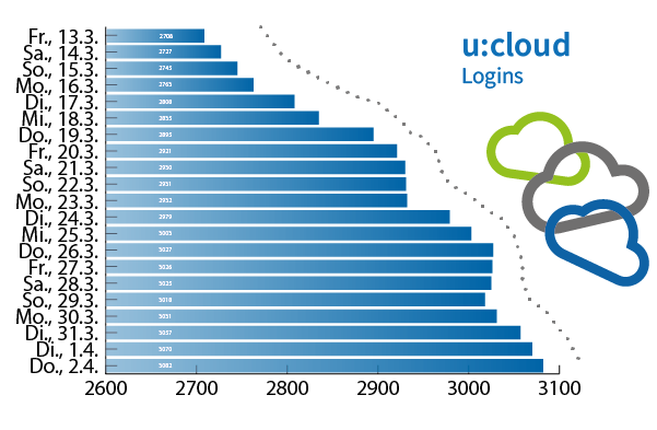 Die Anzahl der Logins in u:cloud, den Cloud-Speicher für Mitarbeiter*innen, ist seit Einführung des Notbetriebs am 16.03. enorm gestiegen. Sie steigerte sich von 2.763 auf 3.027 pro Tag, das entspricht einem Zuwachs von etwa 10%.