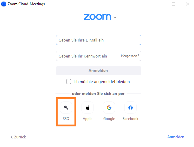 Es öffnet Sich ein Anmeldefenster. Klicken Sie auf das Schlüssel-Symbol (SSO), um sich anzumelden.